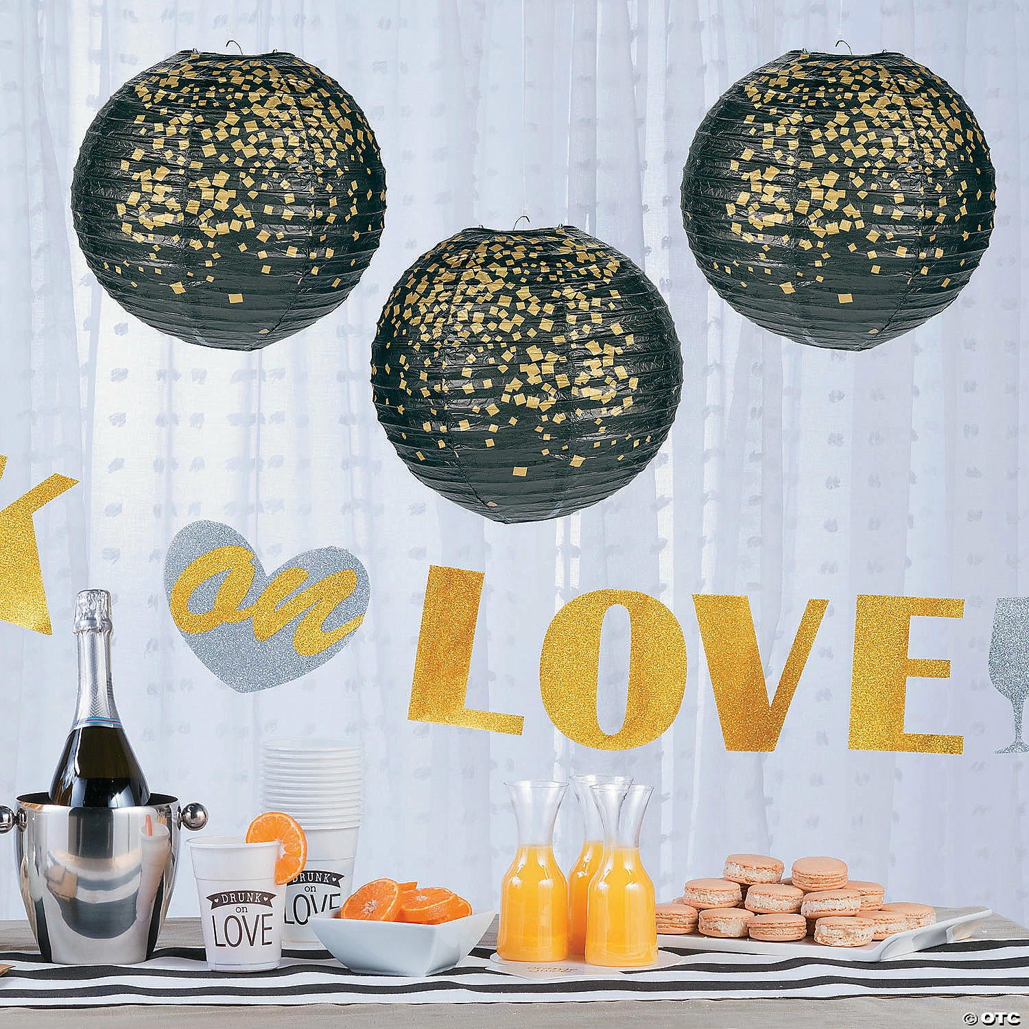 β’ PERFECT FOR ANY EVENT: Add a touch of elegance to bridal showers, wedding receptions, graduation parties, baby showers, birthday parties, and New Yearβs celebrations with these gold and black reusable party decorations. β’ BUDGET-FRIENDLY DIY DΓCOR: Not just for parties, these black lanterns, sprinkled with a gold confetti pattern, make beautiful, affordable additions to your home dΓ©cor, dorm dΓ©cor and more.β’ EASILY ASSEMBLE AND REUSE TIME AFTER TIME: These paper lanterns are easy to assemble and hang. Simply fold them flat after use for easy storage until your next celebration!β’ VIBRANT COLORS: These lanterns offer a stylish, vibrant color that perfectly coordinates with your New Year’s party theme, wedding color scheme, or other event color theme. Product Description:These elegant black and gold paper lanterns are perfect for your gold wedding theme, golden anniversary party, or upscale engagement party. They offer an understated look that catches the eye without distracting from the event. Simply hang them from ceilings, trees, and patios to highlight your black-tie party; add some of our battery-operated tea lights, sold elsewhere on our site, to make them glow.Size: 10″Shape: Round.Quantity: 6Material: Paper.Includes wire hangers. Simple assembly required. Β© OTCBlack & Gold Patterned Hanging Paper Lanterns