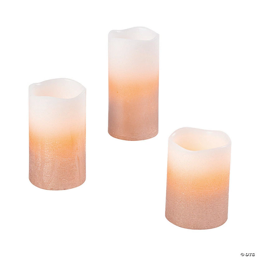 With rose gold hues, these candles will fit in beautifully with wedding dΓ©cor. When you choose these flameless candles, you don’t have to worry about open flames in spaces that don’t allow them, like wedding reception venues and other event spaces. After the event is over, they’ll make a lovely addition to your home dΓ©cor. Plastic. (3 pcs. per set) 3 3/4″ – 6″ x 3″ diam. Each candle requires 3 “AAA” batteries, not included.