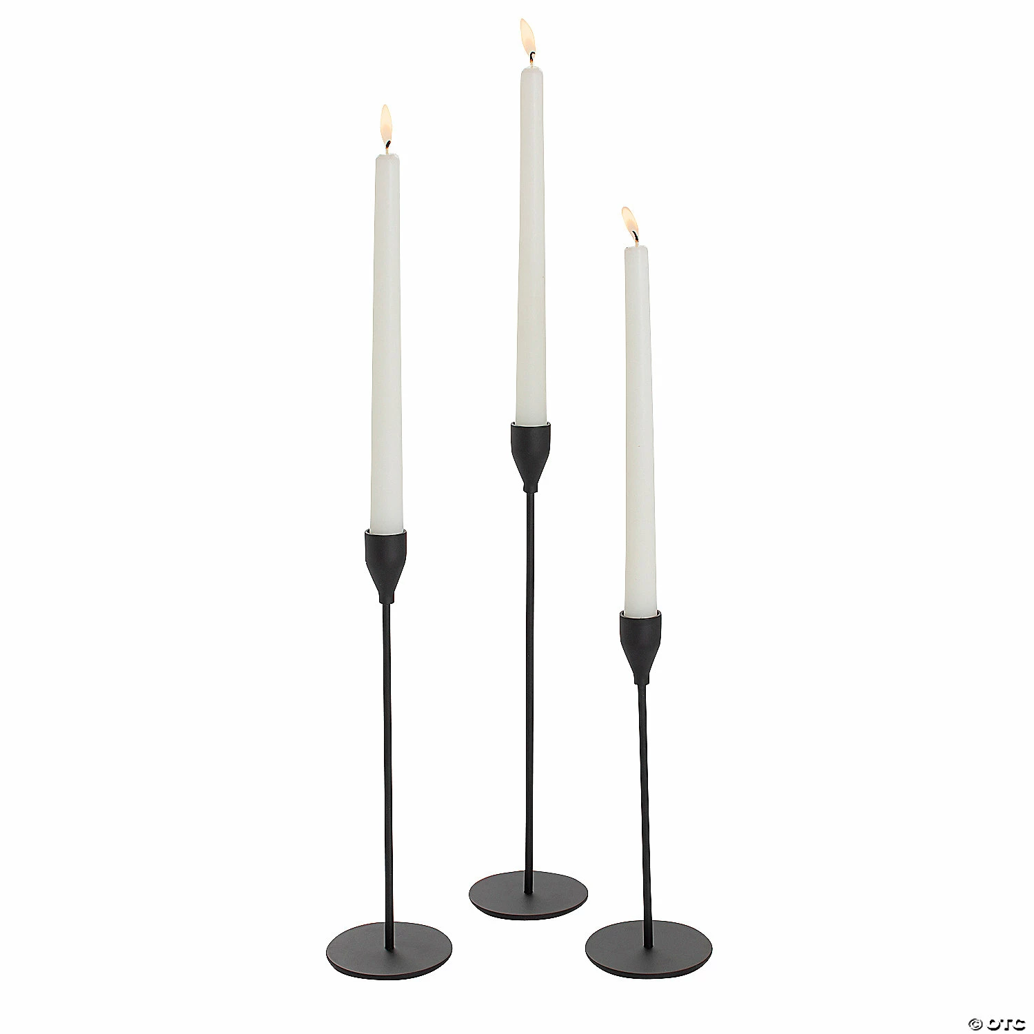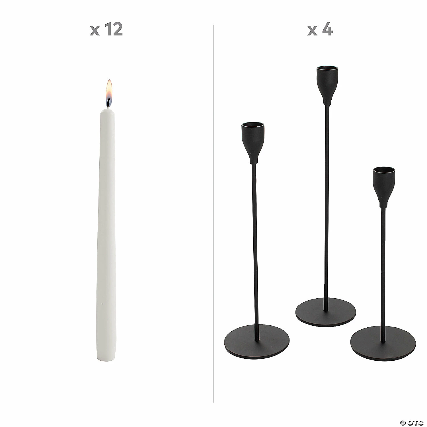 Elevate any formal event to a new level of class with this candle kit! These taper candles mounted on holders are an elegant way to accent centerpieces or stand on their own as dΓ©cor at weddings, anniversaries, fancy gatherings, romantic dinners at home and more. The black-colored stands are sure to look great with a wide variety of dΓ©cor themes. β’ (24 pcs. per unit)Includes:β’ 12 Metal Black Candle Holders (8 1/2″ – 12 1/4″)β’ 12 Wax White Taper Candles (1 1/2″ x 10″)β’ Assortments are subject to change at any time and may vary from picture shown. Substituted items will be similar in nature.