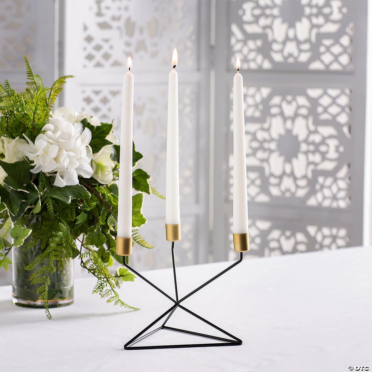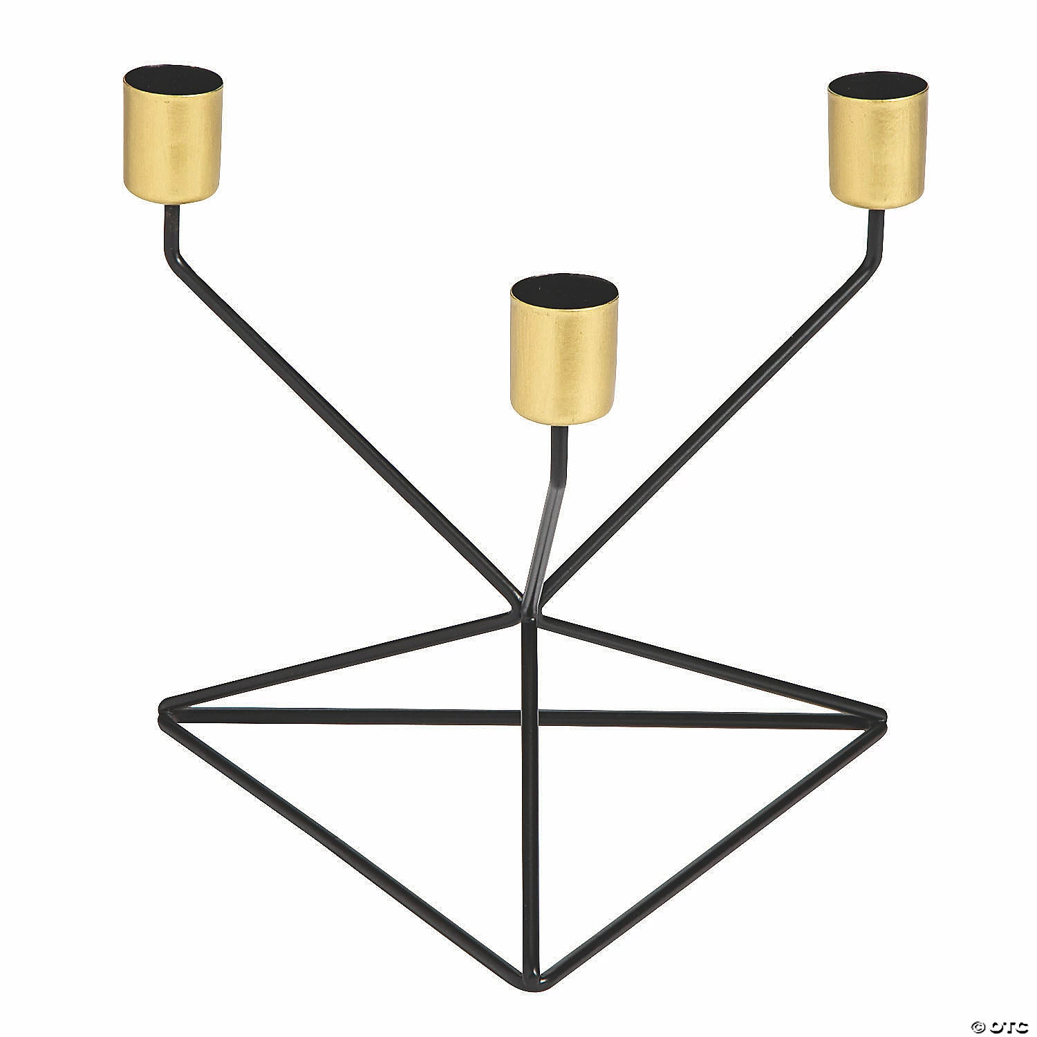 With a chic, geometric style, this taper candle holder makes the perfect addition to wedding decorations. Dress up reception tables, draw attention to the gift table or memorial table or place a few at your head table. This candle holder fits three taper candles. Metal. 7″ x 7″ x 6 1/4″ Candles not included.