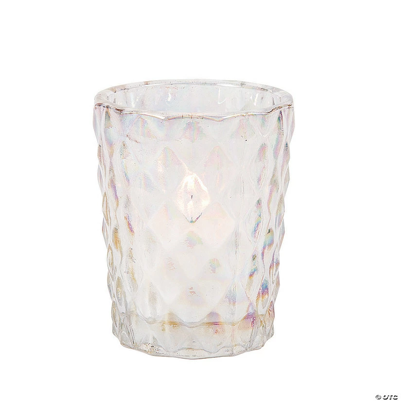Iridescent Diamond Texture Candle Holders are affordable wedding supplies that can also be used as home dΓ©cor and for other events for years to come. Choose these today to add a glow throughout your vintage or modern wedding reception and rehearsal dinners. Diamond-textured votive holders are perfect for any special event. Pair with battery-operated tea lights in any color! Alternatively, the larger size of these votives lends them to be used as bud vases, too. Glass. (6 pcs. per unit) 3 1/2″ x 3″ diam.