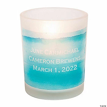 Ahoy there! We’re so glad you sailed to our site. You’re in search of fun wedding favors, aren’t you? Lucky you, these quality Votive Candle Holders double as reception dΓ©cor and wedding favors for guests. Perfect for a nautical wedding theme or wedding colors with blue hues, add these to your wedding decorations, place them on reception tables to create a memorable ambiance and then let guests take a votive home as their party favor! Personalize the vinyl stickers with 3 lines of text. Glass. 2 1/2″ x 2″ diam. Candles sold separately. Simple assembly required to apply personalized sticker. © OTC