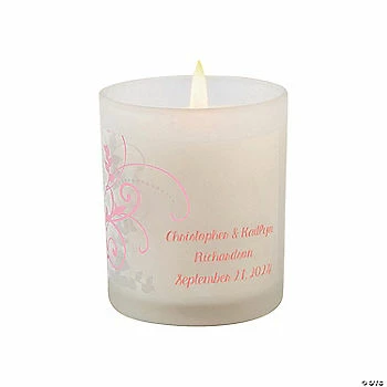 Perfect as wedding reception decorations, Personalized Flourish Wedding Votive Candle Holders can be customized for your wedding. They’re also lovely bridesmaid gifts and party favors for guests. Personalize with three lines of up to 22 characters/spaces per line. Glass. 2 1/2″ x 2″ diam. Simple assembly required to apply personalized sticker. ยฉ OTC