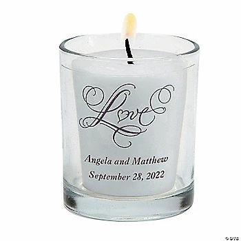 Votive candles may be on the small side, but these Personalized “Love” Wedding Votive Candle Holders will make each of your candles eye-catching with your special message written in an enchanting font. Great for featuring during your wedding, on tables at your reception or even at anniversary parties. See-through stickers personalize these glass Votive Candle Holders with 2 lines of 26 characters/spaces per line. 2 1/2″ x 2″ diam. Simple assembly required to apply personalized sticker. © OTC