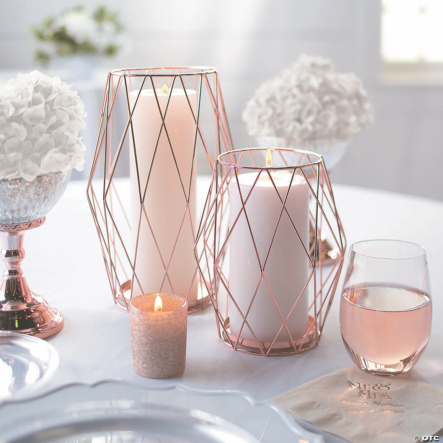 Set the scene for romance with this Rose Gold Candle Holder Set! Pretty and light, these candle holders make beautiful centerpieces or accent decorations at wedding receptions and other special events, and they’re great as everyday decor in your home. Metal. (2 pcs. per set) Large, 7″ x 10″; Small, 5 3/4″ x 6 3/4″.