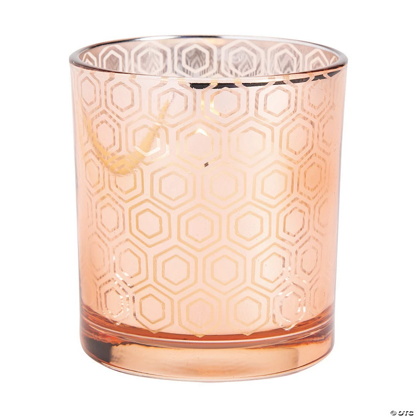 With their lovely geometric design and rose gold look, these votive holders are an elegant choice for a wedding reception or anniversary dinner. Use these votive holders as centerpieces for a sophisticated look or hand them out as party favors. Guests will love receiving a favor theyβll use again and again. Choose candles in muted colors so the votive holders can get the attention they deserve. Glass. (6 pcs. per unit) 2 Β½β x 2β diam. Candles sold separately.