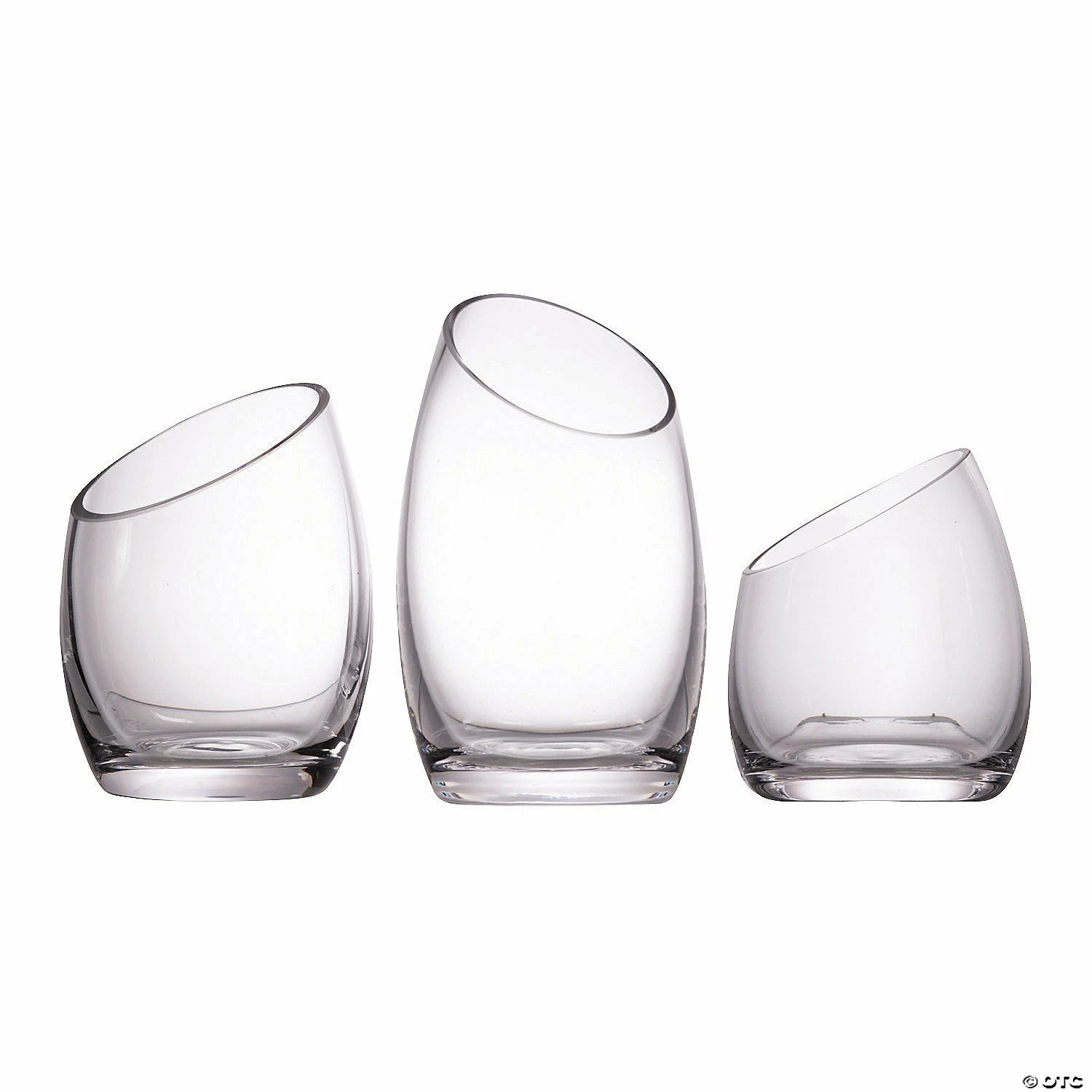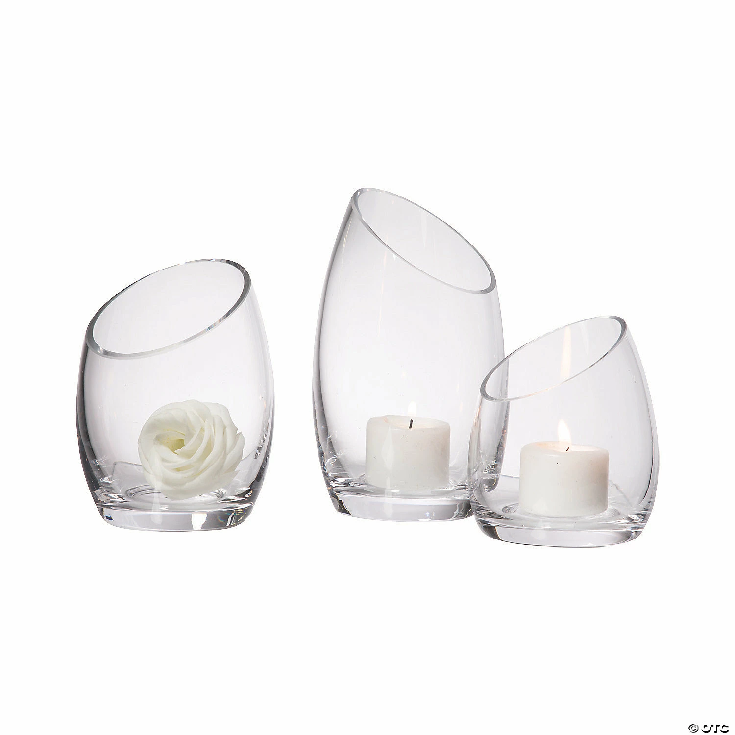On the hunt for unique wedding decorations? Build your centerpieces around these Slanted Votive Candle Holders! Perfect for any wedding reception theme or color scheme, this assortment features various heights of clear glass votive holders. To complete the display, shop our site for battery-operated candles, faux florals and vase fillers. Glass. (3 pcs. per set) 3-1/2″ – 5-1/2″